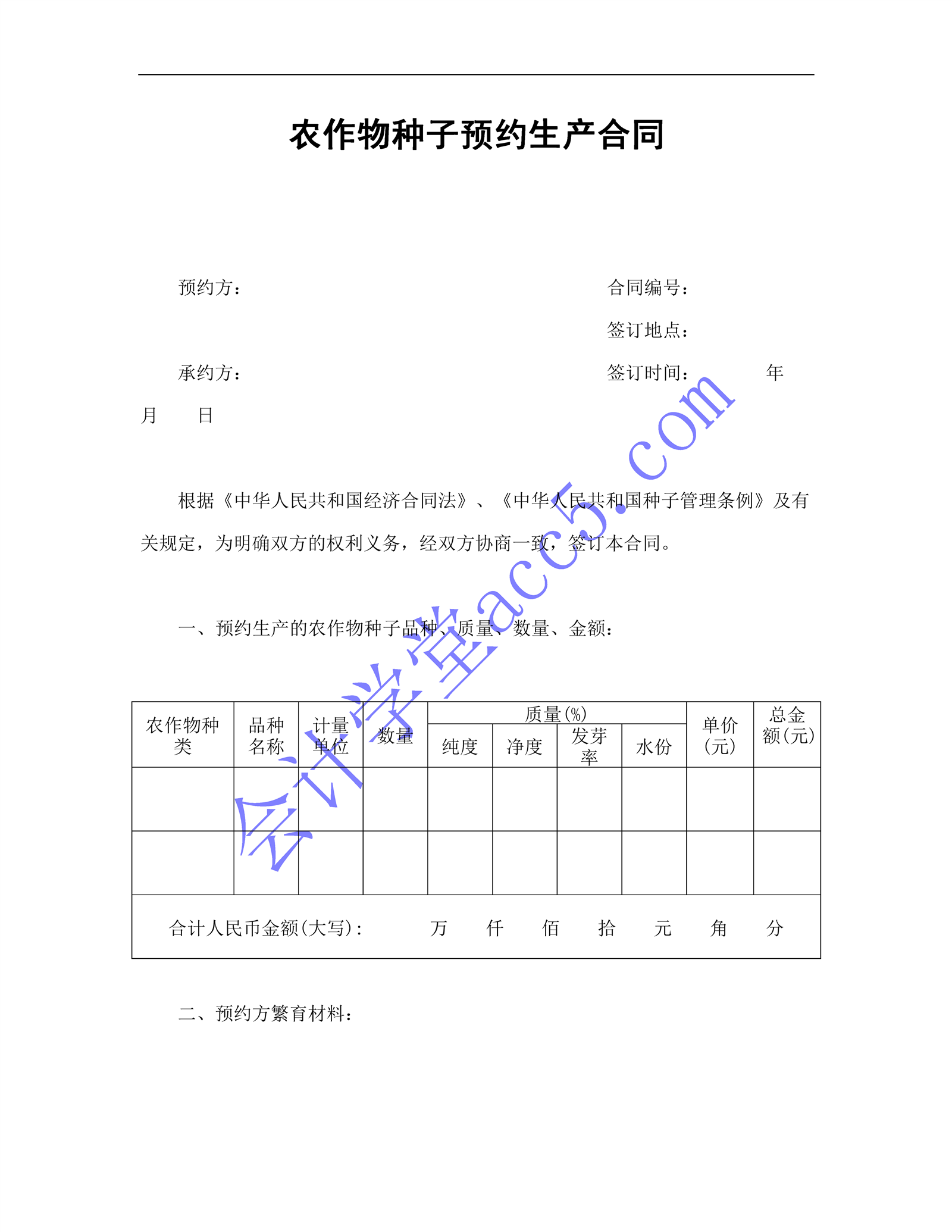农作物种子预约生产合同介绍: