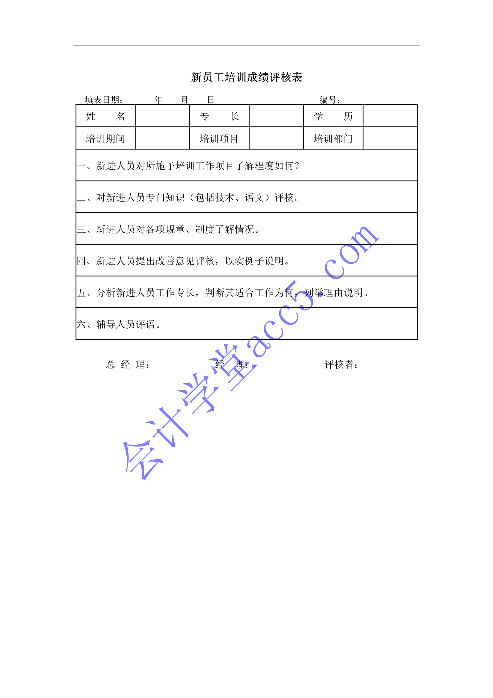 员工培训成绩评核表介绍: